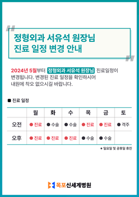 정형외과 서유석 원장 진료 일정 변경 안내목포신세계병원 · 2024년 4월 23일 안녕하세요. 목포신세계병원입니다. 2024년 5월부터 정형외과 서유석 원장님의 진료일정이 변경됩니다. 변경된 진료일정을 확인하시어 내원에 착오 없으시길 바랍니다. 감사합니다.