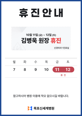 신경외과 김병욱 원장 10월 휴진 안내목포신세계병원 · 2024년 10월 1일 안녕하세요. 목포신세계병원입니다. 10월 11일 (금) ~ 12일 (토) 신경외과 1진료실 김병욱 원장 휴진입니다. 참고하셔서 내원에 차질 없으시길 바랍니다. 감사합니다.
