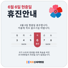 2024년 현충일 휴진 안내목포신세계병원 · 2024년 5월 27일 안녕하세요. 목포신세계병원입니다. 다가오는 현충일인 2024년 6월 6일 (목)에 휴진합니다. 일정 확인하시어 병원 내방에 착오 없으시길 바랍니다. 감사합니다.