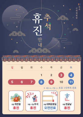 - 10월 5일 (일) ~ 7일 (화) 추석 : 휴진